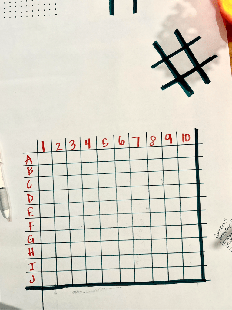 This one took the longest to set up, but it gave us the most laughs. Simply draw an 11×11 grid, label the sides with letters (vertical) and numbers (horizontal), then place your ships in the water. Take up the appropriate spaces for each ship and start launching missiles. Since this game runs a little longer, add a fun twist: the loser gives the winner a shoulder rub.